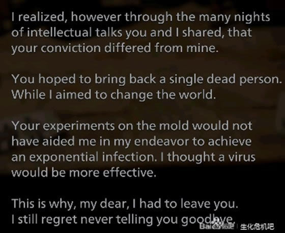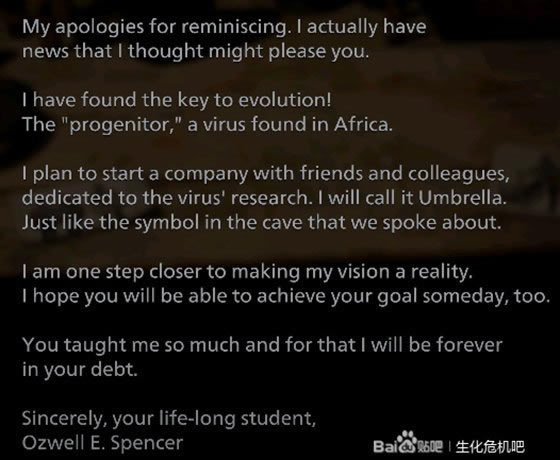 首先,斯宾塞寄给米兰达的信内容总体都是回忆内容为主,信内主要提到斯宾塞自称很想再探望老师米兰达一次,但应为研究问题忙得不可开交,抽不出时间。接下来的内容写道,假设您已经忘了我这位医学院的学生。随后斯宾塞于信件内回忆到15年前刚到村庄时受到老师(米兰达)的启发,认为老师很有远见,通过有机生命体感染村民后来改变他们的性格与外形。斯宾塞自认为自己可以通过学习到的医学知识与米兰达的实验结果结合后做到在让人类进化的愿景。就算经历过两次世界大战,都无法改变他(斯宾塞)的想法
