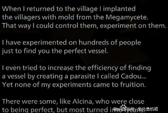 米兰达回到村庄里,并将自己的实验室建立在了村子的地下。她开始疯狂使用村民来做实验,注射霉菌,实验人数多达数人百人都未成功,这么做的目的仅仅只是为了寻找一个合适的容器(丧心病狂到极点,可怜之人必有可恨之处)米兰达为了提高效率,于是创造出了一个寄生体cadou(见图2)米兰达找到了接近完美的容器Alcina但无奈最后依然失败,Alicina就是玩家熟悉的吸血鬼贵妇。一个失败的实验体