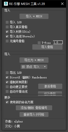 3DMax RE引擎MESH 工具 是3DMax的一个扩展插件,允许您在3DMax中直接导入生化危机系列的*.MESH模型文件,