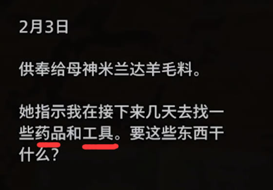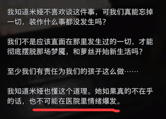 另提1局,克里斯是在9号夜晚找到的米娅,当时米娅在牢里,连个送饭的都没有,加入太早被劫持,估计都被饿死了,另外开局冰箱上写了2月6日和2月7日Rose的食物,后面跟了一句伊森的字,但是没有写2月8日当晚的食物
