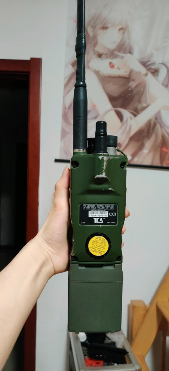 电台书很常见的AN/prc152电台,首先好评是方向放对了,大部分真冰都会把液晶屏朝里放方便取出电台调节频率,但是这个天线我必须吐槽,图里的折尺天线就算折起来,我打水弹的时候都会碍事,而克里斯不仅不添加一根延长线收纳天线,连折叠都不折叠,示例图是TCA复刻的152A电台,与152区别是背部多了个卫星天线