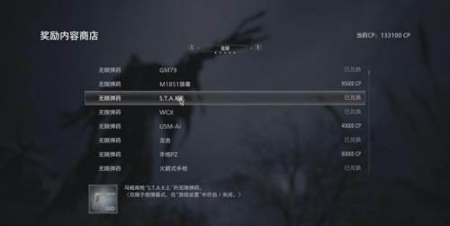 同时在游戏中将武器对升满级,配件全部装上即可解锁对应武器的无限子弹,可在通关一次后解锁的奖励商店中用用完成挑战获得CP点数兑换。