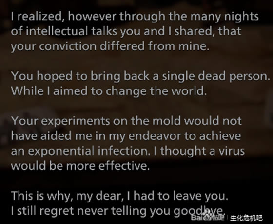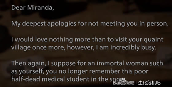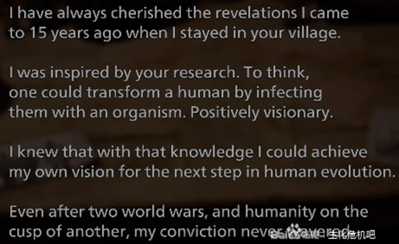首先,斯宾塞寄给米兰达的信内容总体都是回忆内容为主,信内主要提到斯宾塞自称很想再探望老师米兰达一次,但应为研究问题忙得不可开交,抽不出时间。接下来的内容写道,假设您已经忘了我这位医学院的学生。随后斯宾塞于信件内回忆到15年前刚到村庄时受到老师(米兰达)的启发,认为老师很有远见,通过有机生命体感染村民后来改变他们的性格与外形。斯宾塞自认为自己可以通过学习到的医学知识与米兰达的实验结果结合后做到在让人类进化的愿景。就算经历过两次世界大战,都无法改变他(斯宾塞)的想法