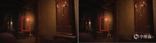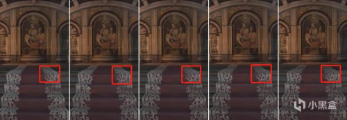 主要区别在于地毯的向后延伸处,如图红框所示,三线性过滤下,向后延伸部分地毯纹理的黑色分切线非常不明显。随着各向异性纹理的倍数提升,这一分切线才能清楚体现出来。