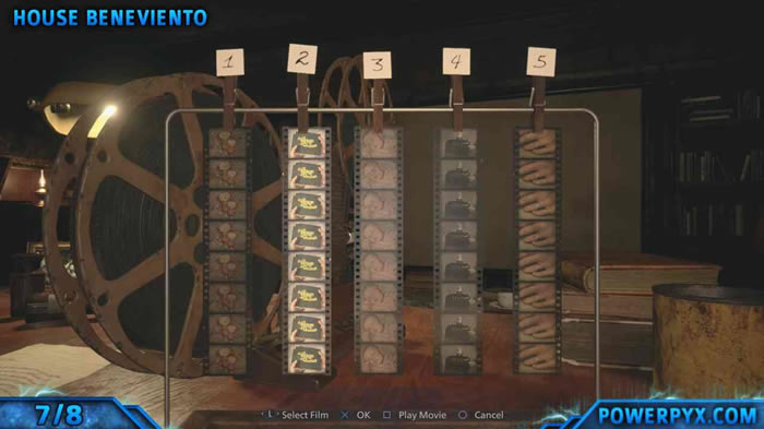 打开音乐盒将为您提供镊子。在娃娃的嘴上使用这些胶片来获得胶卷,然后回过走廊,最后进入书房。将胶卷胶片放到投影机上。您必须重新排列5个幻灯片,才能将它们按特定顺序放置。5条胶片的正确顺序是:1)毛绒玩具> 2)乡村图书> 3)婴儿> 4)音乐盒> 5)结婚戒指。这里的编号表示1最左边,5最右边。
