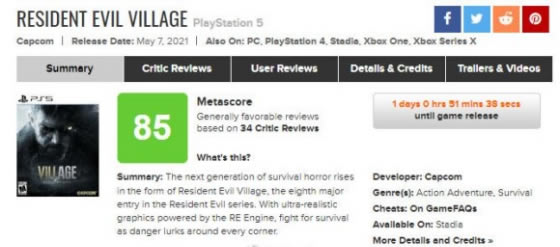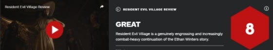 《生化危机8》全球媒体评分解禁,IGN 8分,Game Spot 9分,Metacritic均分85,共收录34家游戏媒体。