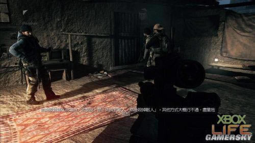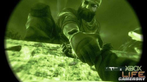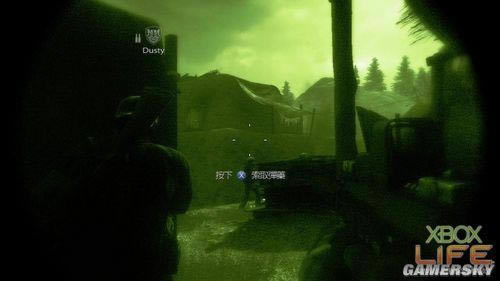 两人持续前进来到一座大门前,「脏人」指派「杜斯」进入左方的建筑物内掩护队友并处理左方的敌人,当「杜斯」来到屋内后,迅速的解决站在两边高塔上的卫兵后,其余三名队友也在此时进行了无声的攻坚行动。完全清空这区的敌人后,「杜斯」便离开建筑物并通过大门与小桥,来到前方的屋内与队友会合。