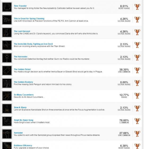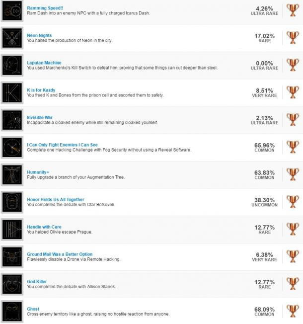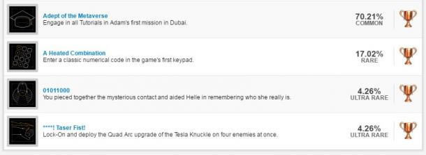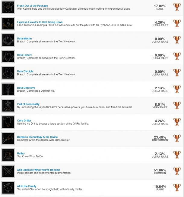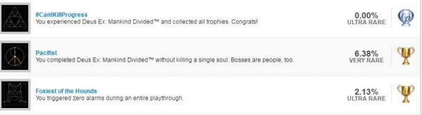 今天PSN Profiles曝光了《杀出重围:人类分裂》的完整奖杯列表,游戏总共包含51个成就,玩家们如果想要获得白金奖杯就必须完成所有成就,其中包含不杀人通关并且不能触发警报。