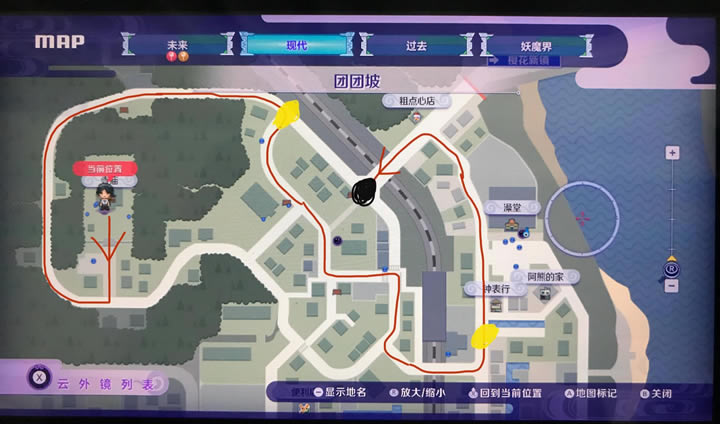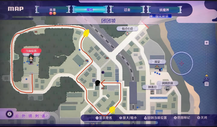 具体路线如图三,你在天正寺出发,门口就有马先生给你加速跑步,图上两个黄点就是会出现熊的地方(不是它就是雷爸爸,或者两只一起),到了第二个点都没有打出魂的话就直接结束任务重来,黑点是boss黑猪的位置。这个路线还是比较顺畅的,熊幸运的话可以遇见最多4只,加油打出它的妖魂吧。