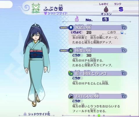 貌似人气妖怪NO.1,也被不少人设定为跟随状态,无论光明还是阴影模式都拥有着倾国倾城的颜值,配上温柔的声音,简直就是直男杀手。小编入手的第一只S级妖怪就是大吹雪姬(那时候刚玩,天天扭蛋机盼着出她的S魂)。角色人设参照于《百鬼夜行》中的雪女,属于比较阴暗、可怜的妖怪。技能方面,拥有着华丽的组合,首先由于高妖力的数值,输出技能“冻结之术”与必杀技“大冰锥”拥有着非常可观的输出与AOE范围;治疗方面,拥有单体治疗最强的“极乐之术”与治疗HOT技能“超·回复之术”(持续加血,类似魔兽世界治疗德鲁伊的HOT治疗概念);以及驱散负面效果的“驱逐阵”(AOE驱散)。现版本当之无愧的第一治疗,本可以靠颜值占据队伍中的一席之地,她偏偏要靠实力!