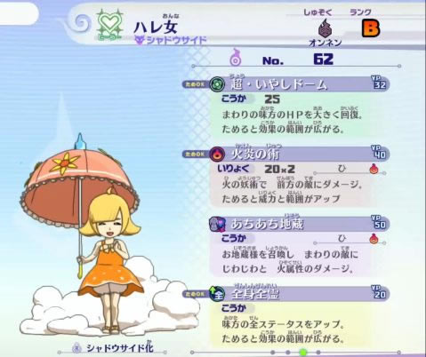 晴女和雨女都拥有着不错的人气,一个生动活泼一个楚楚可怜,简直就是萝莉党的杀手(然而小编只爱大吹雪姬)。技能方面,拥有少有的回复技能“超·治疗光波”(僵尸妹妹的治疗光波加强版),也能进行蓄力;搭配了两个输出向技能“火炎术”和“火焰佛像”;同时有提供全团思维属性的“全身全灵术”,蓄力可增加范围。变身后化为雨女,再次增强技能的威力。