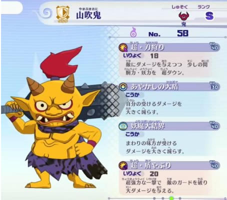黄鬼山吹,提醒没有赤青黑那么巨大,但拥有优于其他几位的超高输出能力。小编最爱的一只怪!自身拥有可观的防御能力,同时拥有爆炸输出与碎盾技能;最突出的是,“妖魔大结界”是一个给予全团大减伤的VIP技能!由于被动技能的存在,很多时候造成的伤害比同队DPS还要高上许多。