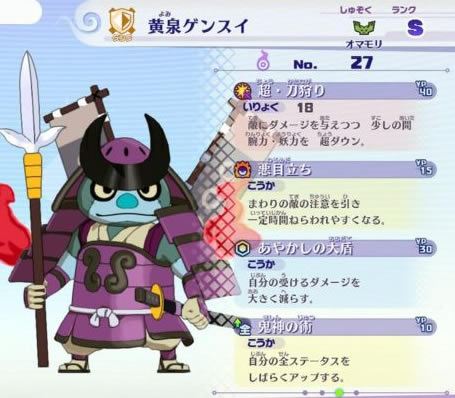 TIPS:在我另一篇帖子中有提到坦克妖怪的性格选择,分不清“可靠”与“拼搏”的同学可以点我头像看一下那篇推送。由于“恶目”技能的存在,同时伴随着优秀的属性与四维提升技能,让黄泉元帅也处于一个能抗能打的位置。但是需要注意的是,在“恶目”CD期间,选择“拼搏”性格的黄泉元帅是不具备常驻仇恨值的(也就是说这段时间内其余两名队友是不受到坦克妖怪的保护的),而且对于团队来说没有想黄鬼山吹那样的群体减伤技能。然而选择“可靠”性格对于黄泉元帅的技能来说未免有点屈才。不像山吹可以带2个DPS甚至加一个输出向主角(因为黄鬼山吹防御技能多一个团减),使用黄泉将军时,队伍里需要配备一个治疗妖怪或者主角关注他的血量。总体来说,黄泉将军是“目立”性格坦克的代表妖怪。