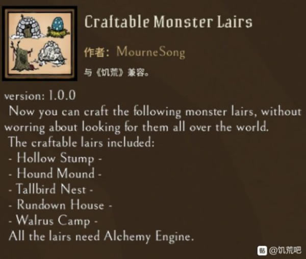 这个mod可以制造怪物巢穴:狸猫树洞、狗窝、高脚鸟巢、鱼人小屋等,但有些破坏平衡,尤其是海象屋