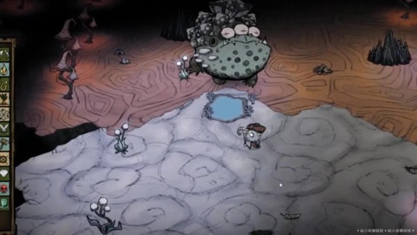 召唤蟾蜍时,先让队友距离蟾蜍远一点。蟾蜍出来之后,先带着它走到其中一个池塘后面,站位是「蟾蜍池塘玩家洞」,这边仔细观察蟾蜍,蟾蜍追玩家到一定时间会想回出生地种蘑菇树,这段时间是不会攻击的,用这段时间输出非常安全。