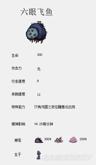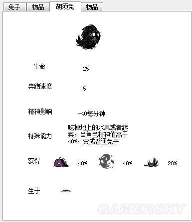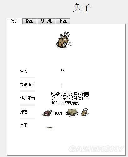 捕捉方法同兔子,40%掉落怪物肉,40%掉落噩梦燃料,20%掉落胡须。