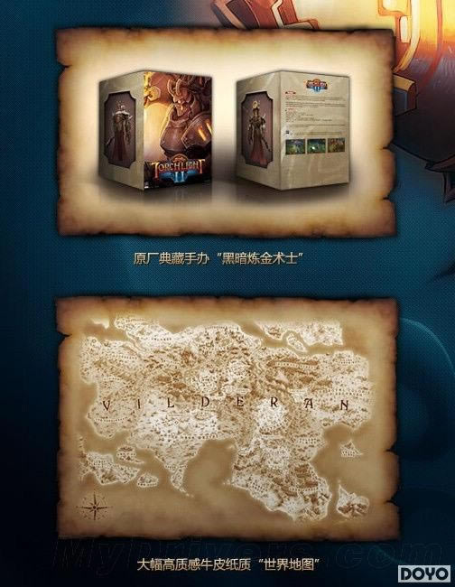 从官网公布的消息可知,简体中文版《火炬之光2》的典藏版限量500套,将从今年5月2日开始配送,包装内包含游戏本体、黑暗炼金术师手办、原声音乐CD以及一张高质感牛皮纸游戏地图。