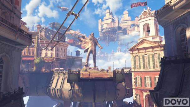 《生化奇兵:无限》的开场和其前作貌合神离。游戏里有许多剧情,在这里我们就不详说了。但不得不说。哥伦比亚城的揭幕着实壮观。进入一座陌生的城市并不会吸引太多目光,但却饱含着漂泊不定的旅客情结。和《大镖客》一样,本作的开场也极富信心,这通常是大作应有的姿态。不以低俗的暴力与肉体吸引玩家,而是通过唯美风景与小资情调感染玩家。